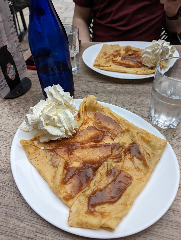 We’d decided that one food we really had to have, being in France, was crepes. A lot of places were closing as it was lunchtime, so we took a stroll along the harbor and found a place that advertised its crepes specifically. Somewhat strangely, nobody there seemed to speak English. I say this not from a positive of ‘English entitlement’ but more surprise that a place so front-and-center in the tourist area wouldn’t have more English-speaking staff, but it is what it is. Using our waiter’s almost-non-existent English and my almost-non-existent French we decided on a crepe each and waited for their arrival.