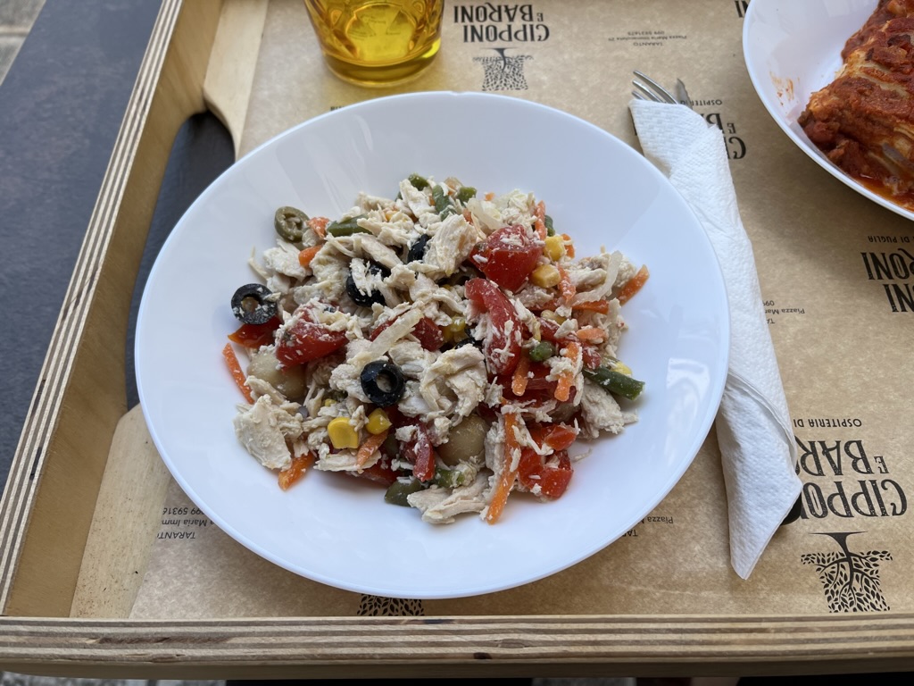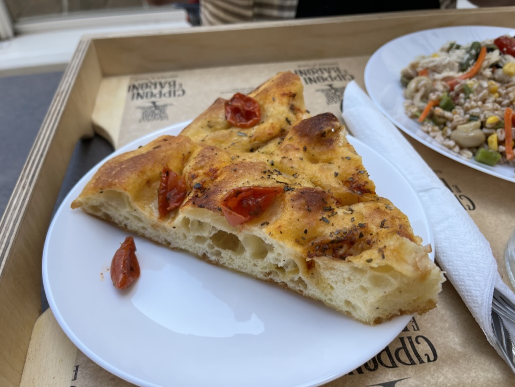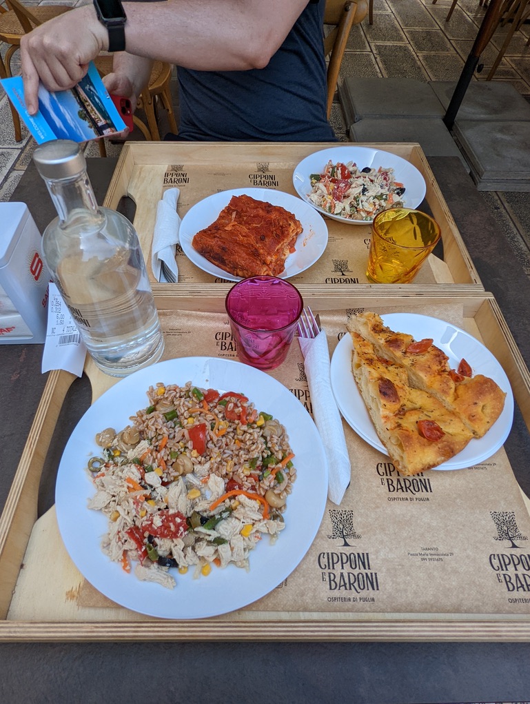 After about 15 minutes, we found ourselves at a rickety road bridge next to a small fort, so we crossed over (quickly!) and kept walking in search of food. The first place we came across was a sort of restaurant, sort of buffet. We loaded up with focaccia bread and lasagna and ate outside in the glorious sun (albeit in a covered area because it was really hot!)