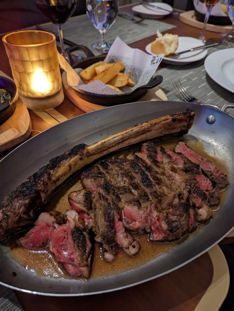 The first night was for the Steakhouse, overlooking the Grand Foyer. I was mildly annoyed to be told that shorts weren’t allowed in the premium restaurants; then, after changing, I saw someone else seated next to us wearing shorts unchallenged, but it wasn’t a big deal. The food, as expected, was delicious.